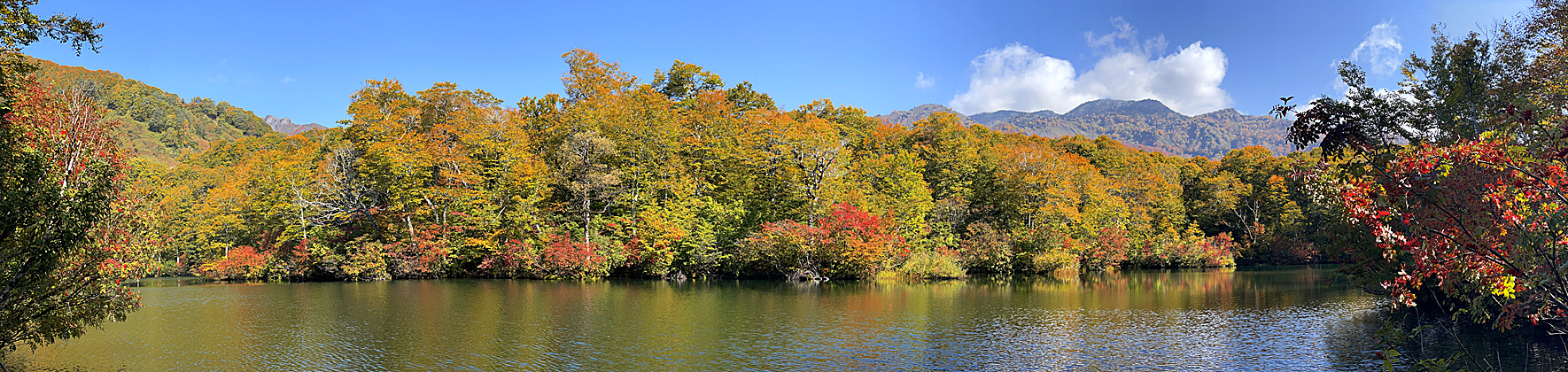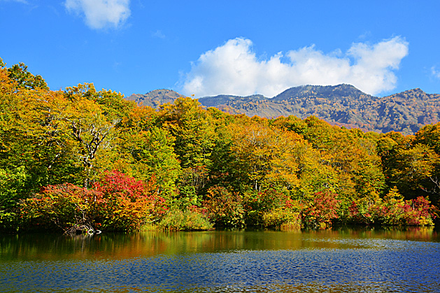 ブナ等の黄色・ウルシ類とナナカマドの赤がきれいでした。遊歩道はブナ林の中がほとんどで、紅葉越しに池を見る感じです。鎌池を見渡せる場所はわずかです。そこには、カメラマンがたくさん。風で水面が波打ちイマイチでした。午前9時45分。 |