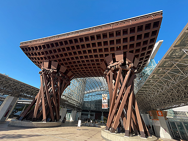 | 令和7年(2025年)11月12日 水曜日 石川県金沢市金沢駅東口。「鼓門(つづみもん)」と「もてなしドーム」が迎えてくれました。午前10時頃。共に2005年竣工。鼓門(つづみもん)は、高さ約13.7メートル・幅約25メートルあるそうです。重量感あるつくりです。能楽の鼓を模して造られ、伝統芸能を想像させるデザイン。驚きと共に金沢のランドマークだと納得しました。もてなしドームは、雨にぬれないよう「おもてなしの心」から命名されたそうです。雪吊りが施されていました。 |