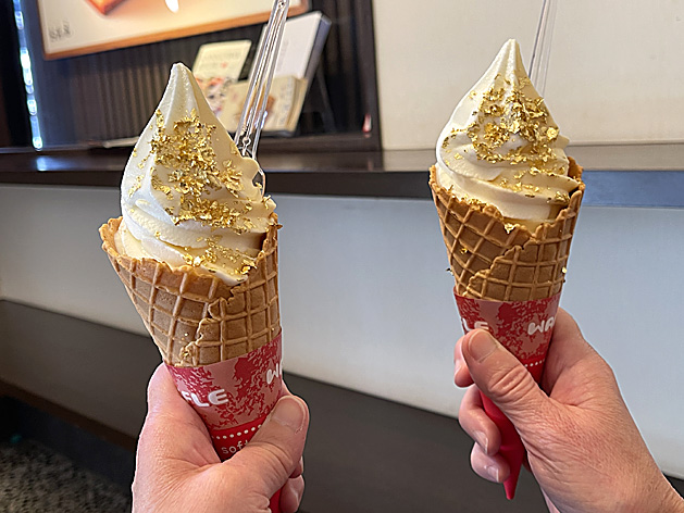 烏鶏庵(うけいあん)という店に入り、烏骨鶏卵(うこっけいらん)ソフトクリーム 金箔ありを食べました。おいしかったです。午前10時40分頃。金箔ありとなしで、200円違いました。金箔ありは、700円。 |