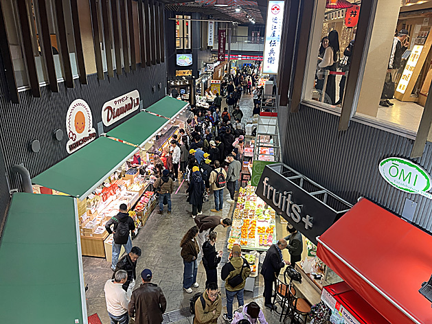 | 近江町市場の賑わい。午後1時15分頃。300年以上の歴史があるそうです。平日ですが、人は多かったです。ビル2階の通路から俯瞰。カニ等の海産物・青果等がたくさん売られていました。コロッケを食べました。 |
