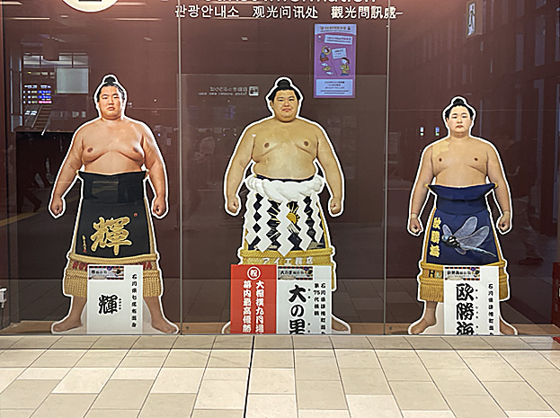 すぐ近くに、石川県出身力士の写真が誇らし気に展示してありました。午後4時20分頃。ほぼ等身大だと思います。 |