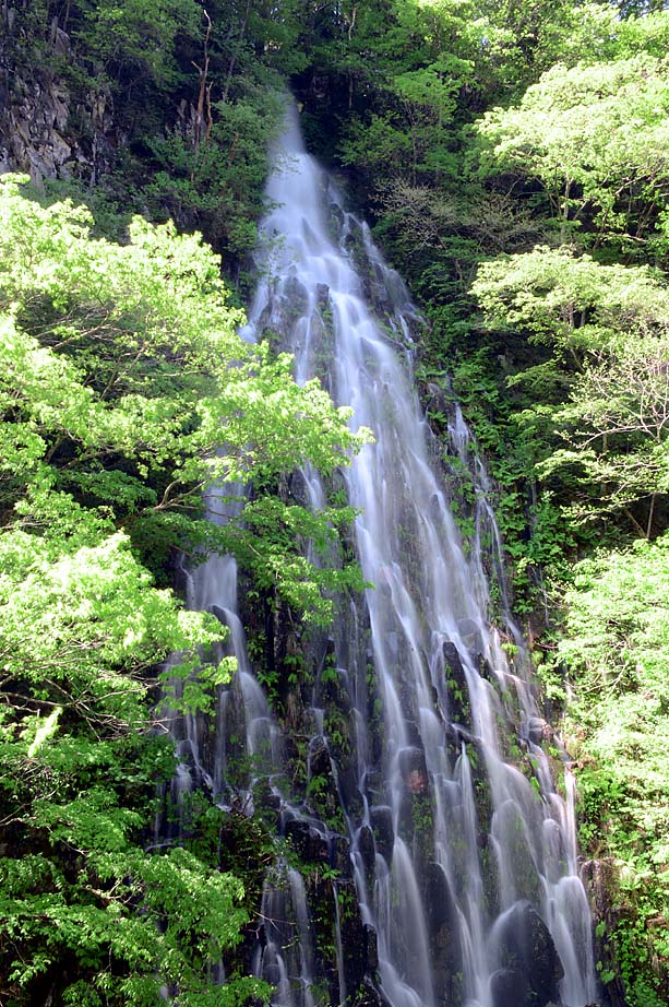 新緑の中を流れ落ちる木島平村上木島の「樽滝」。平成28年5月8日(日曜日)午前9時20分頃。新緑の季節には、5月8日に放水され出現します。1年に春と秋の2回見る事ができます。シャッター速度を0.5秒に設定し絞りはオート(22)。「幻の滝」ともいわれ、全国から見物客・カメラマンなどが訪れます。28年は日曜日だったのでラッキーでした。平成27年には、紅葉の樽滝を撮影してあります。